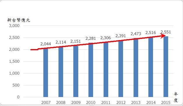 ▲圖1 2007年到2016年我國資訊服務產業總營收(資料來源:經濟部統計處)